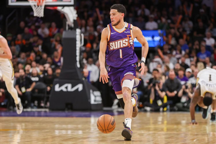 Feb 27, 2025; Phoenix, Arizona, USA; Phoenix Suns guard Devin Booker (1) dribbles against the New Orleans Pelicans in the fourth quarter at Footprint Center. Mandatory Credit: Brett Davis-Imagn Images