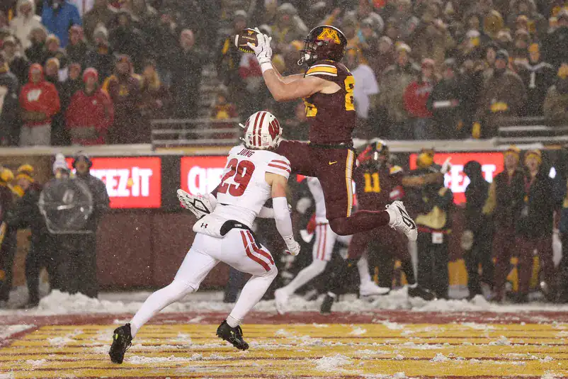 a touchdown pass against the Wisconsin Badgers during the second half at Huntington Bank Stadium.